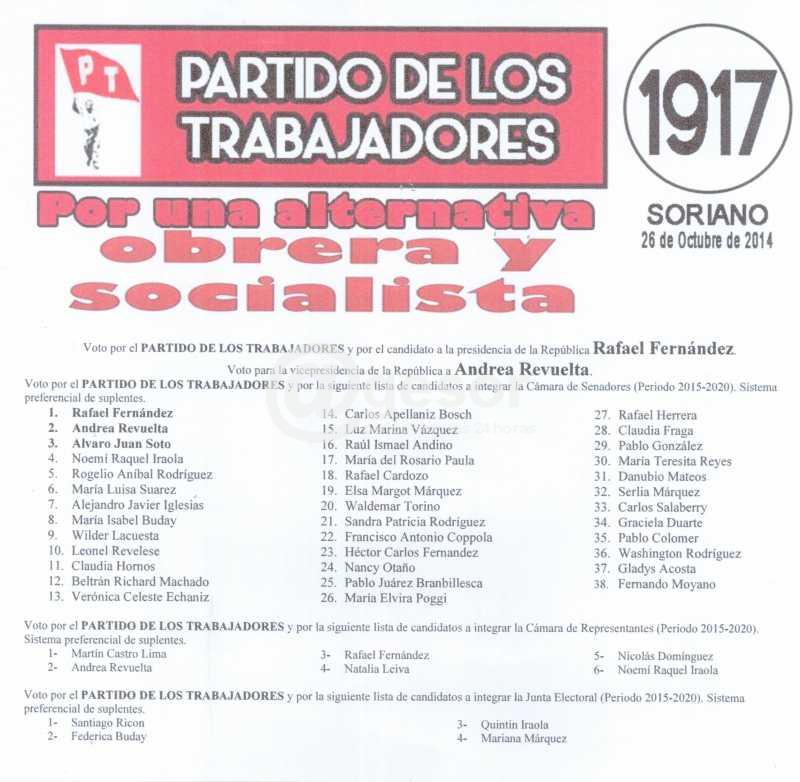 El Partido de los Trabajadores en Soriano presenta una hoja de votación, la 1917, encabezada por la fórmula Rafael Fernández y Andrea Revuelta, el candidato a diputado es Martín Castro. Adjunta ofrecemos la hoja de votación.