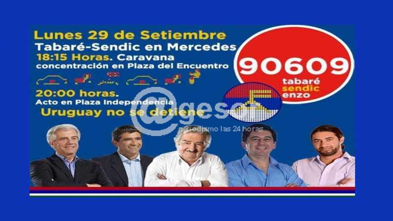Sin la presencia de candidatos o dirigentes locales y con un escenario dominado por una pantalla gigante y una bandera uruguaya la fórmula presidencial del Frente Amplio realizó su acto en Mercedes. Previamente una caravana de autos y diferentes vehículos embanderados recorrieron gran parte de l...