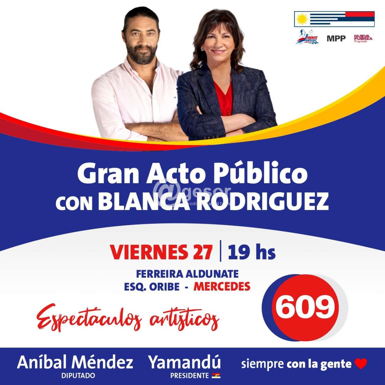 Este viernes 27 de setiembre a las 19.00 horas, en Ferreira Aldunate esquina Oribe, el Espacio 609 de Soriano te invita a gran acto público con la presencia de BLANCA RODRÍGUEZ segunda candidata al Senado, que estará visitando el departamento para acompañar la candidatura a la Diputación de ANÍBAL M&Eacu...