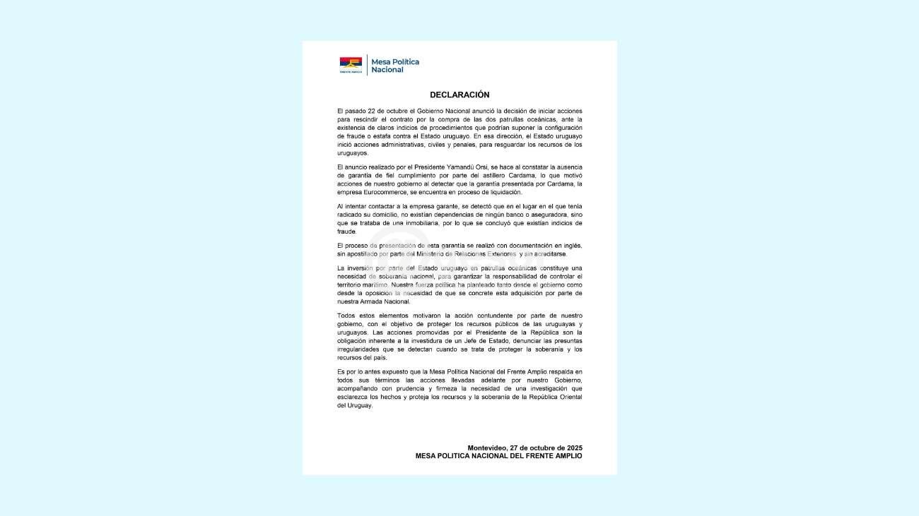 El pasado 22 de octubre el Gobierno Nacional anunció la decisión de iniciar acciones para rescindir el contrato por la compra de las dos patrullas oceánicas, ante la existencia de claros indicios de procedimientos que podrían suponer la configuración de fraude o estafa contra el Estado uruguayo. En esa direcci&...