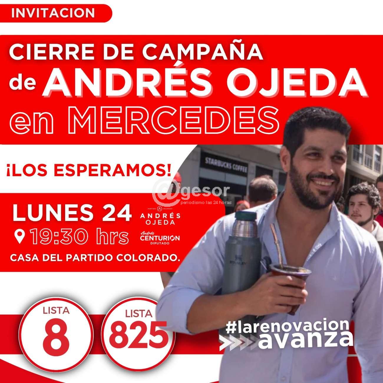 Cierre de campaña de ANDRÉS OJEDA en MERCEDES junto a ANDRÉS CENTURIÓN este LUNES 24 a las 19.30 horas en CASA DEL PARTIDO COLORADO, listas 8 y 825