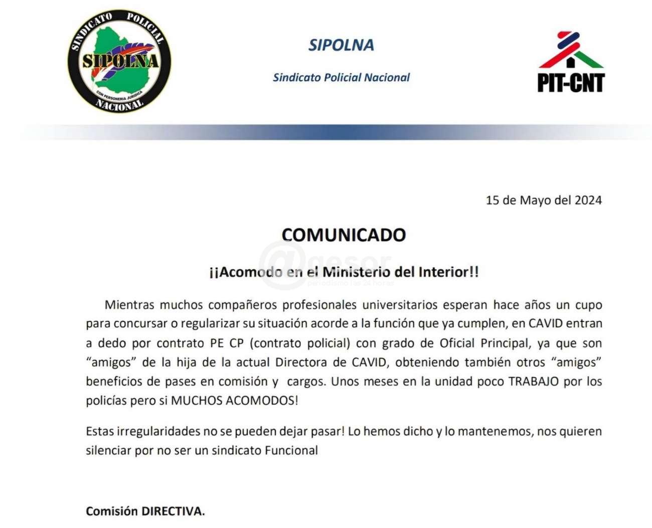 La Comisión Directiva del SIPOLNA (Sindicato Policial Nacional) emitió comunicado titulándolo "¡¡Acomodo en el Ministerio del Interior!!" y aunque no la mencione dirigido a la exPresidenta del sindicato Patricia Rodríguez quien pasó a dedicarse a la política dentro del Partido Nacio...
