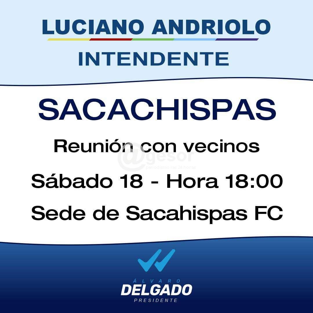 El candidato a Intendente por el Partido Nacional, Luciano Andriolo, estará este sábado 18 de mayo dialoganco con los vecinos de Sacachispas. La reunión se realizará en la Sede Social de Sacachispas FC, a partir de las 18 horas.