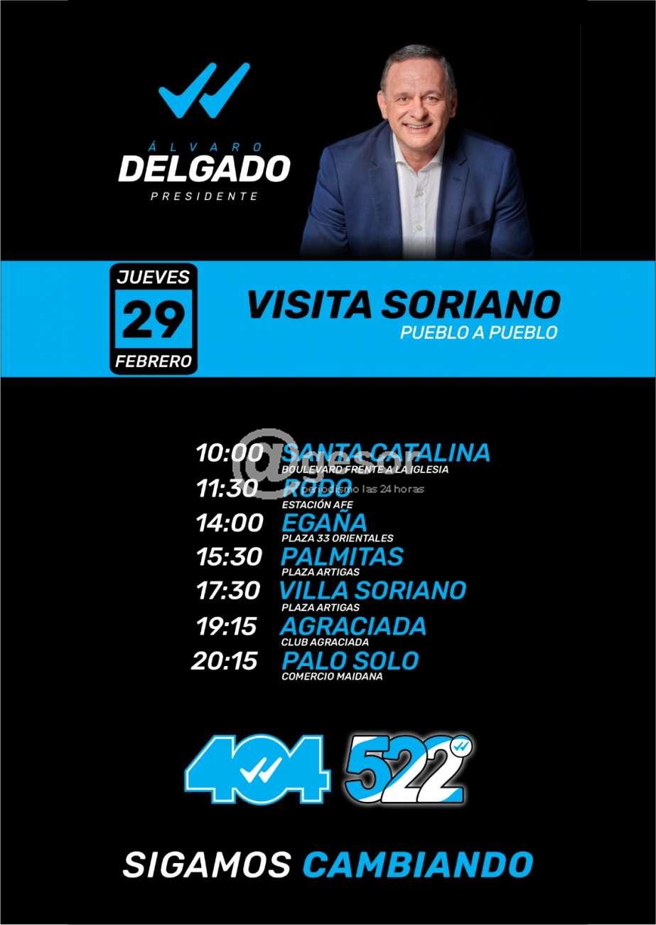 Las Listas 404 522 con su eslogan "Sigamos Cambiando" del Partido Nacional están invitando a acompañar la gira del precandidato a la Presidencia de la República, el nacionalista Alvaro Delgado, este jueves 29 de febrero a localidades de Soriano.