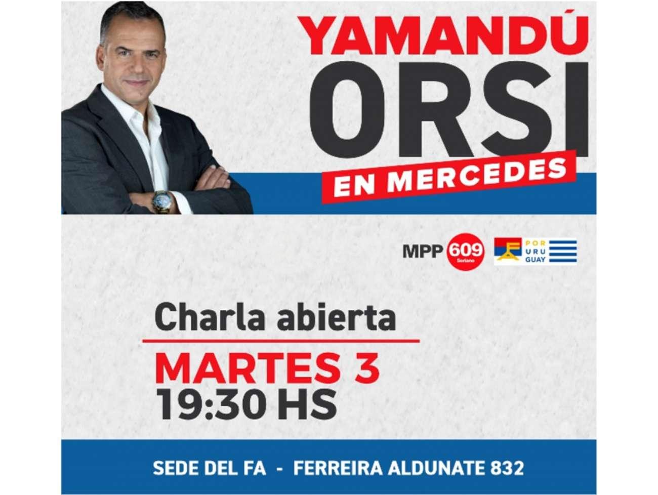 Este martes 3 de octubre estará desarrollándose charla abierta a las 19.30 horas en Sede de la Departamental del Frente Amplio con la presencia de YAMANDÚ ORSI en Mercedes para dialogar con los frenteamplistas y con los ciudadanos en general que deseen escuchar a quien seguramente sea uno de los precandidatos de la f...