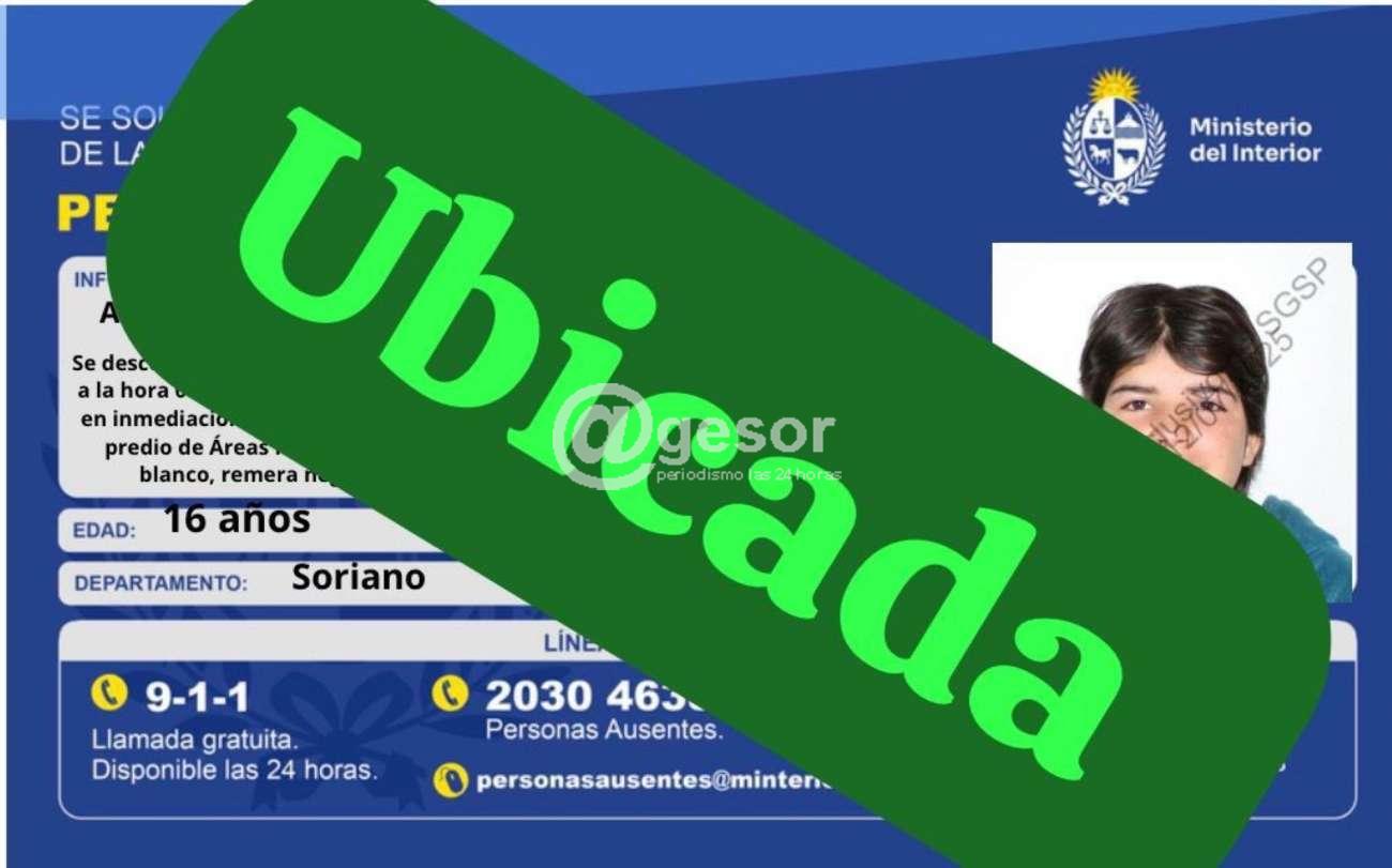 La Jefatura de Policía de Soriano informó que la adolescente de 16 años que estaba siendo buscada por haberse ausentado desde el día 14 de marzo a las 8.00 horas en zona de Areas Pedagógicas en el Centro de Mercedes.