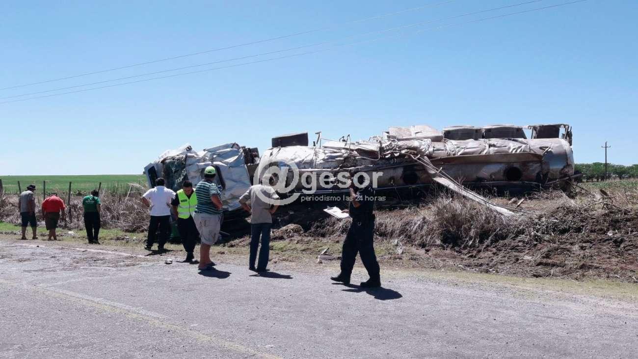 Un camión semi remolque cargado de madera volcó en la radial de acceso a Palmitas, tirando una columna del tendido eléctrico.