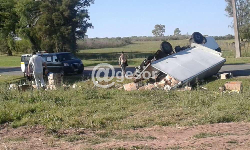 Un siniestro de tránsito protagonizado por un camión que transportaba comestibles y bebidas, circulando por Ruta 2 de Sur a Norte, en las huellas que quedan en el pavimento por el tránsito de los camiones de gran porte, el conductor perdió el dominio del vehículo, volcando. Viajaban en el camión dos pers...