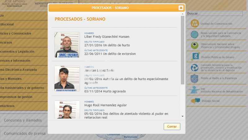 El Ministerio del Interior volvió a actualizar el registro de personas procesadas con prisión y con atecedentes penales en nuestro país. En el caso del departamento de Soriano aparecen los recientes procesados por distintos hechos delictivos cometidos.