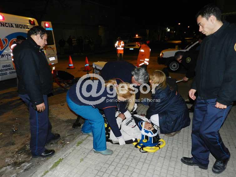 Eran las 21.20 de este sábado en Mercedes, cuando el automóvil marca Toyota Corolla KMA 3620, conducido por Ever Martínez, quien iba a compañado de su señora circulando por Casagrande, al cruzar de 18 de Julio fue embestido a la altura de la puerta trasera, violentamente, por la moto Winner Fair 110 cc KMA 529 ...