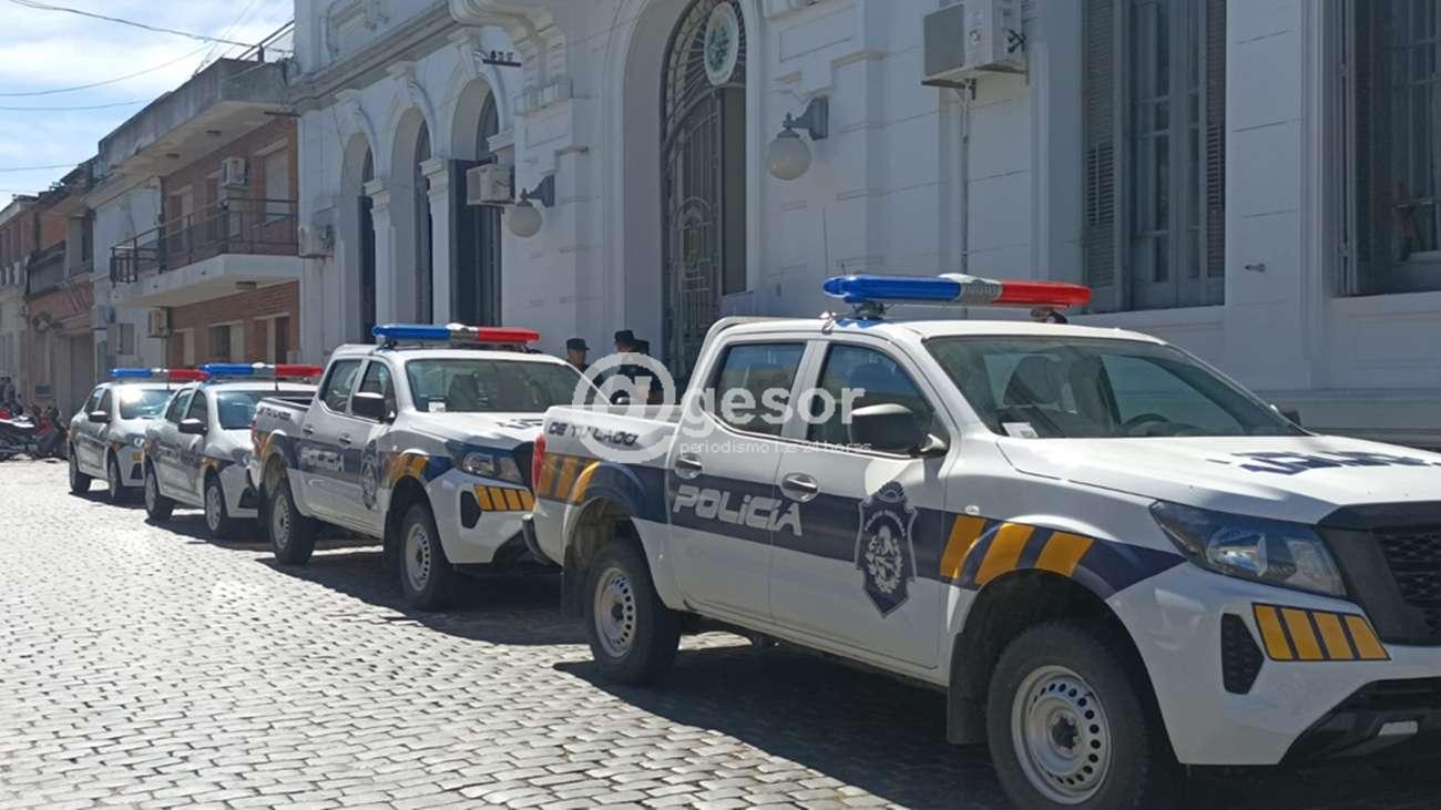 Jefatura de Policía presentó la nueva flota vehicular que pasará a cumplir funciones en el interior del departamento y en Mercedes. Se trata de dos nuevas camionetas más dos vehículos de recambio "y esto va a continuar con otros vehículos que vienen también para recam...