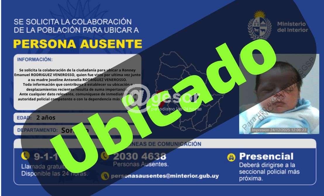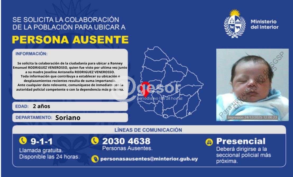 Se trata de Ronney Emanuel Rodríguez Venerosso de 2 años, quien fue visto por última vez junto a su madre, Josefina Antonella Rodríguez Venerosso de 24 años, de Soriano.