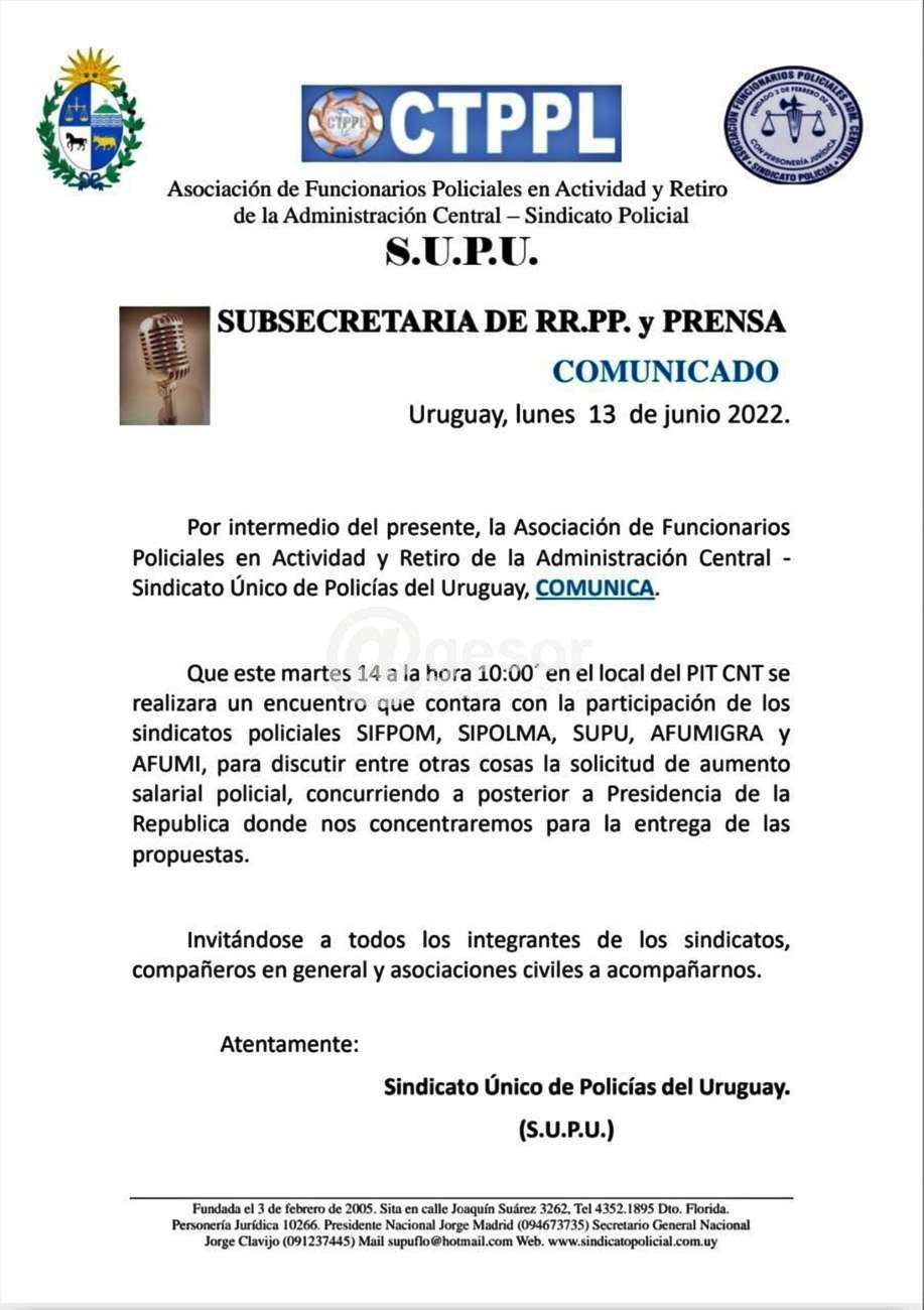 Uno de los sindicatos policiales, el SUPU, hizo llegar a @gesor comunicado en el que informa: "Este martes a las 10.00 horas en la sede del PIT CNT se realizá un encuentro que contará con la participará de los sindicatos policiales SIFPOM, SIPOLMA, SUPU, AFUMIGRA y AFUMI, "para discutir entre otras...
