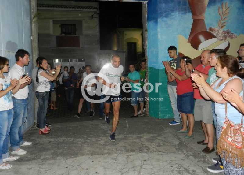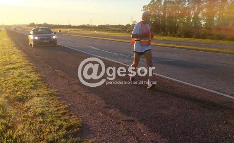 El maratonista llegó a Palmitas, donde descansa un poco, a fin de retomar su esfuerzo.