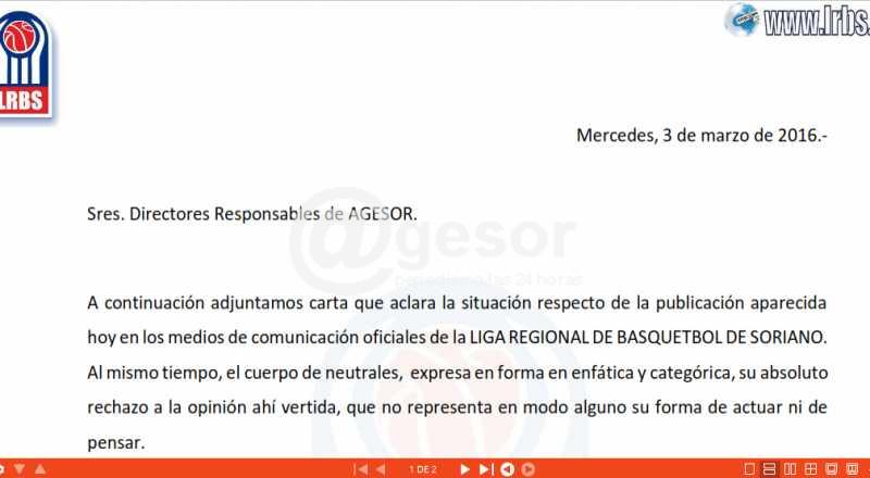 En las últimas horas, @gesor recibió la comunicación telefónica del Vicepresidente de la Liga Regional de Básquetbol de Soriano, Osvaldo García, quien dejó claro que el texto publicado desde las cuentas oficiales de la LRBS contra nuestra Agencia de Noticias, no representa la posi...