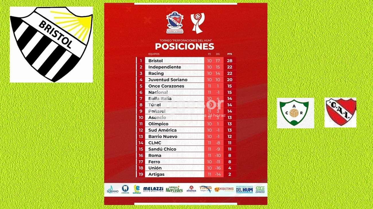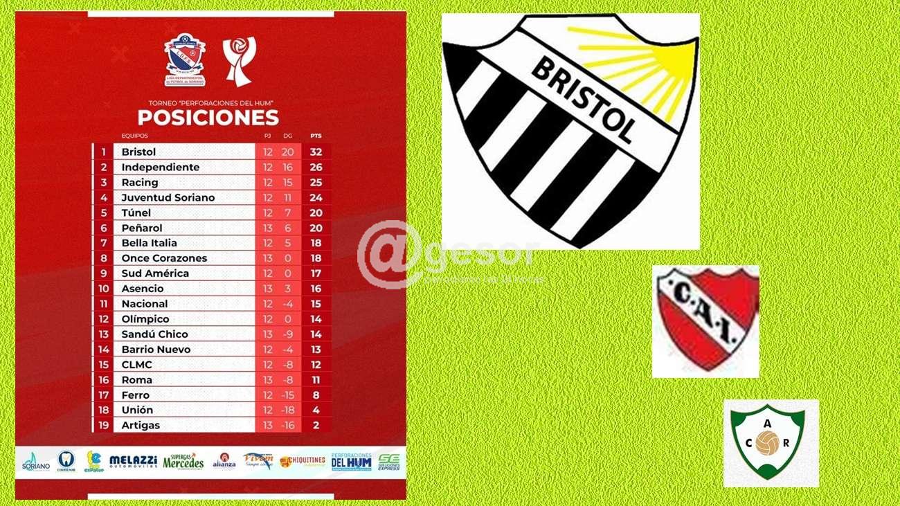 Al finalizar la 13ª fecha del fútbol de Mercedes Bristol tiene 32 puntos, tras empatar con Juventud Soriano. Seguido por Independiente con 26, y Racing con 25.
