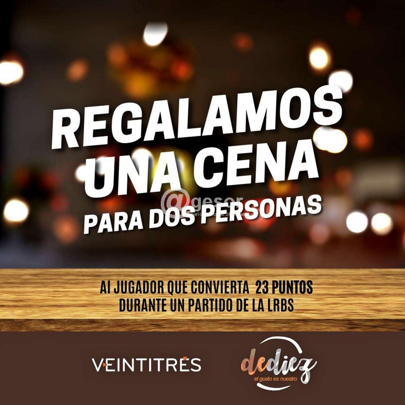 Una inédita promoción se pone en marcha desde este jueves para todos los partidos de la Liga Regional de Básquetbol de Soriano y por ende para todos los jugadores que participan del 83º Campeonato Competencia de la LRBS, de la mano de VEINTITRÉS y Restaurante DeDiez.