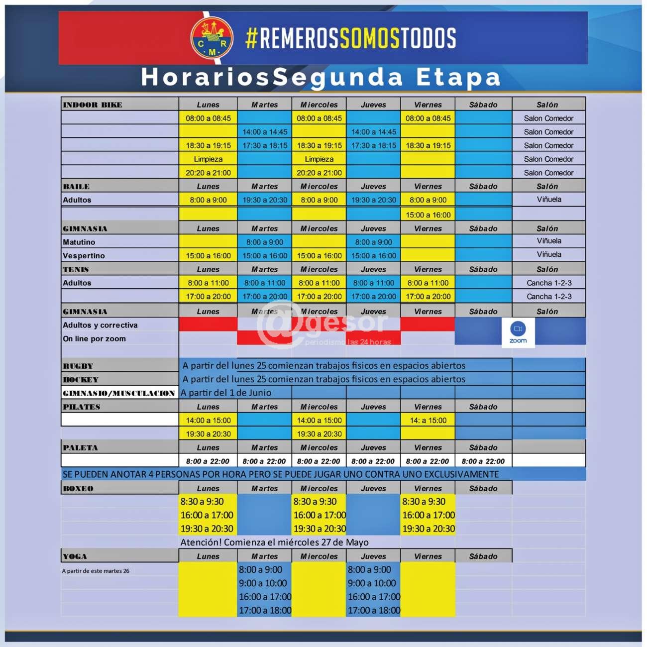 Club Remeros Mercedes reinicia actividades este lunes 18 con spinning, baile, gimnasia y tenis. Estiman entre 400 y 500 socios los que regresan a la práctica activa de los ejercicios cumpliendo con estricto protocolo de prevención. En la fotografía adjunta encuentran el detalle de las actividades con los días y horari...