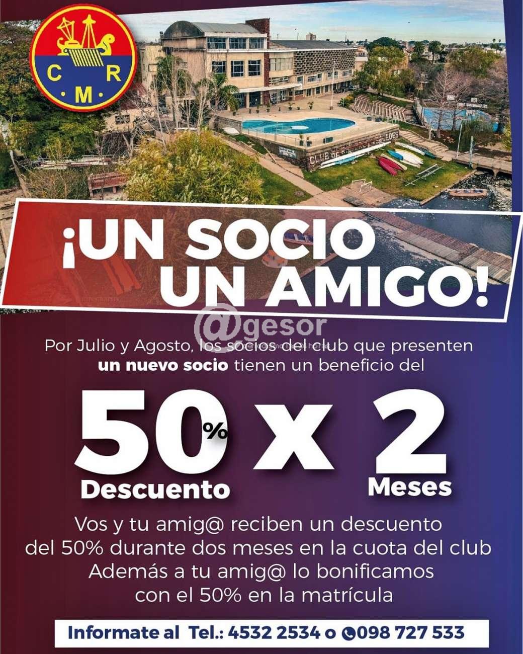 ¡En julio y agosto todos los socios que presenten un NUEVO SOCIO tienen un 50% de descuento en la cuota durante dos meses, los dos! ¡Y además al nuevo socio lo BONIFICAMOS con un 50% en la matrícula!¡Este es el momento de asociarte a Club de Remeros Mercedes!
