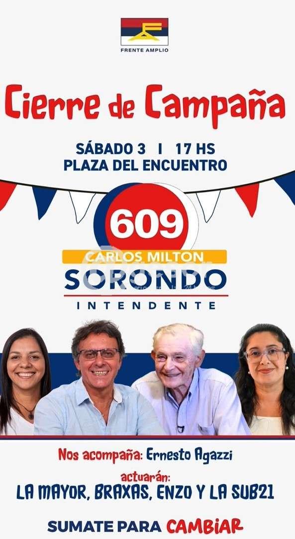 Las listas que apoyan la candidatura de Carlos Milton Sorondo a la Intendencia realizaron su acto de cierre de campaña. Este acto se realizó en Plaza del Encuentro de Mercedes contándose con la presencia del diputado Fernando Amado, y del ex ministro de Ganadería, y ex senador Ernesto Agazzi. Además del d...