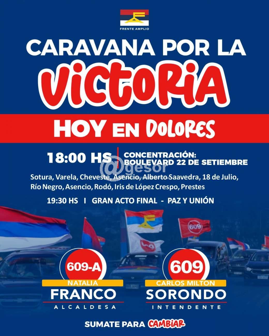 El Frente Amplio de Soriano recorrió las calles mercedarias en la “Caravana de la Victoria”. Los tres candidatos a intendente, Carla Di Stasio, Pablo Ponce, y Carlos Milton Sorondo encabezaron la columna frenteamplista que fue acompañada por referentes y simpatizantes de todos los sectores en este recorrido por la...