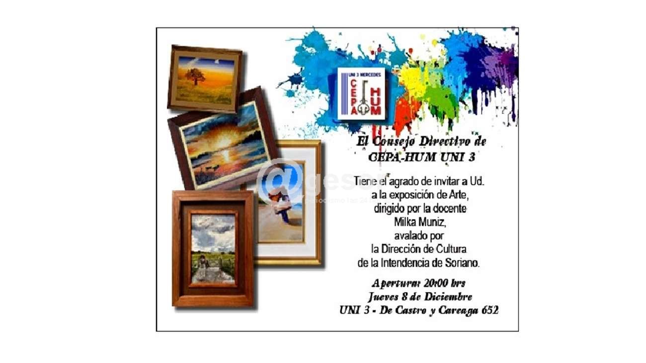 El jueves 8 de diciembre se realizará la apertura de la muestra Exposición de Arte de CEPA-HUM UNI 3. Se trata de los trabajos realizados durante el año del taller dirigido por la docente Milka Muñiz y avalados por la Dirección de Cultura de la Intendencia de Sori...