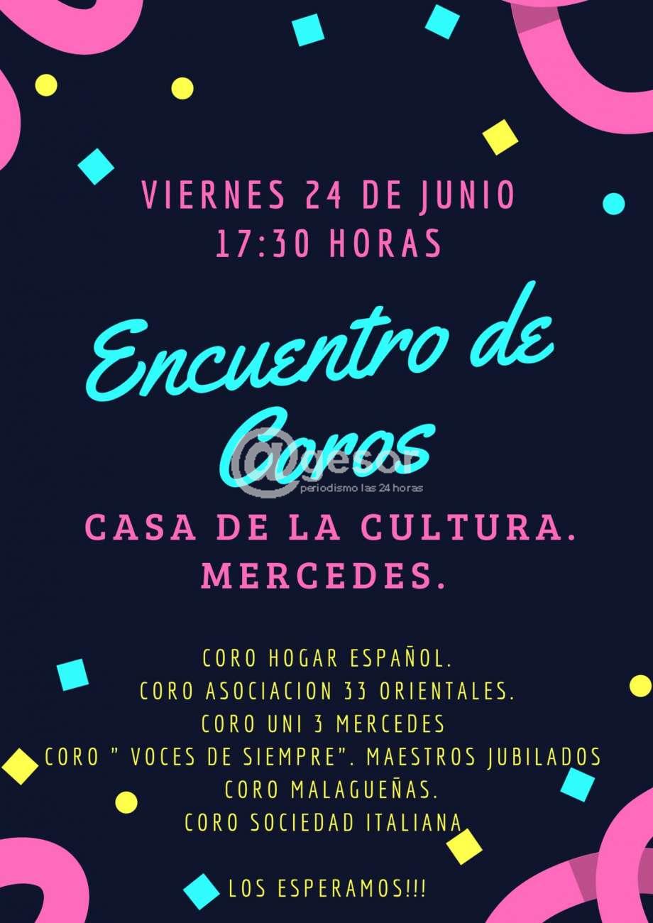 El viernes 24 de junio en Casa de la Cultura de Mercedes se realizará el festival del Reencuentro de Coros. Una actividad comenzará a las 17,30 horas, actuando:
