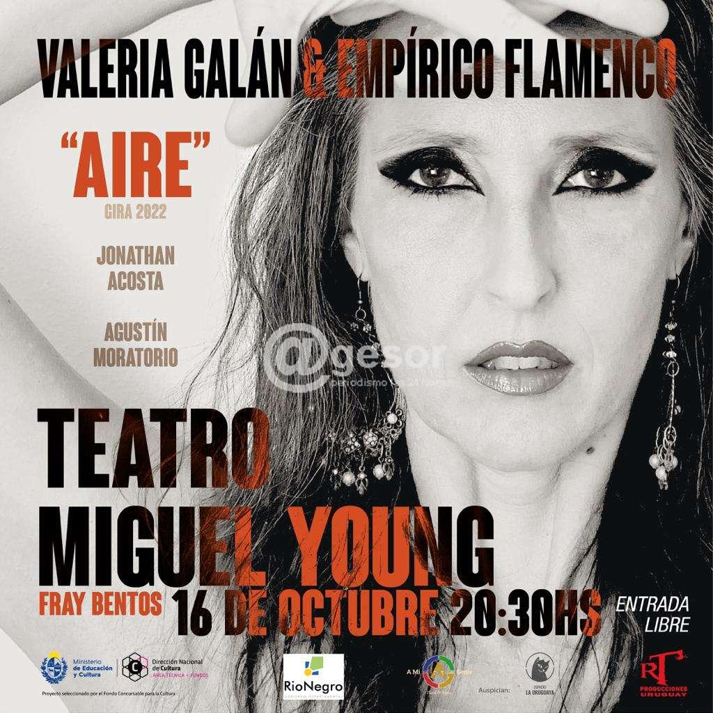 El domingo 16 de octubre la bailarina Valeria Galán presentará su espectáculo “Aire”, acompañada de Empírico Flamenco, en el Teatro Miguel Young de Fray Bentos. Un espectáculo seleccionado por el Fondo Concursable para la Cultura del Ministerio de Edu...