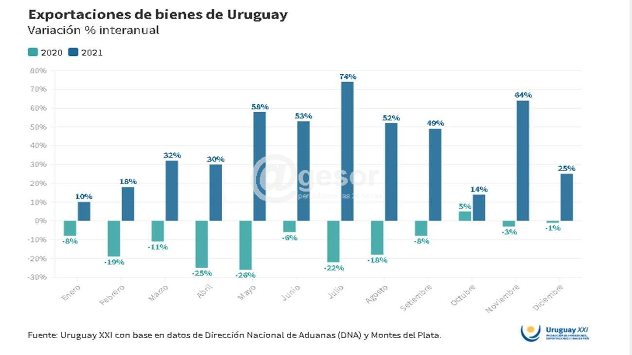 El 2021 cerró con una suba de las exportaciones uruguayas de bienes de 40% marcando el mayor registro histórico. La carne bovina fue el producto con mayor incidencia por mejores precios y mayores volúmenes, destacándose China una vez más como el principal socio comercial.
