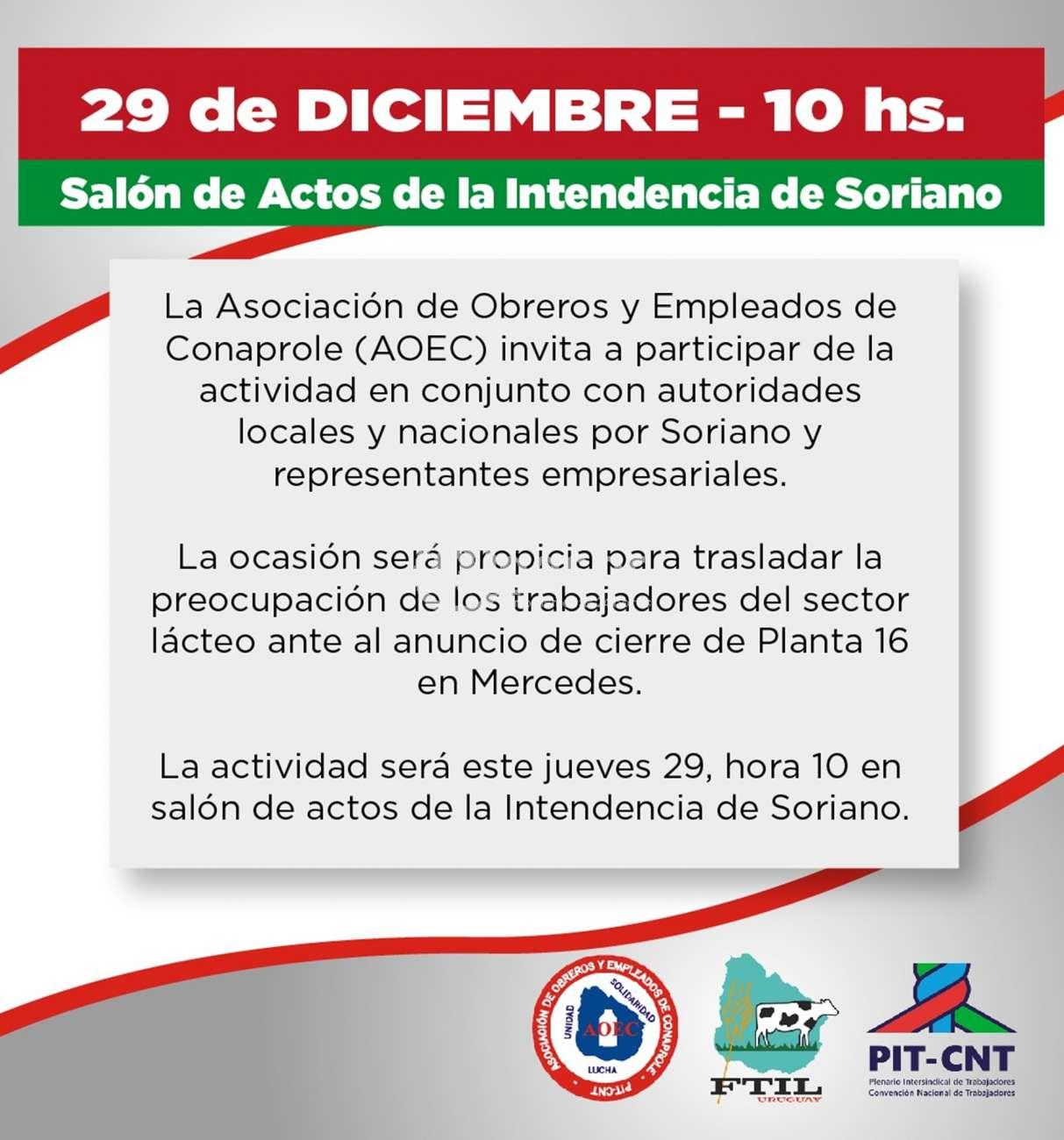 Trabajadores de Conaprole informarán sobre el futuro de la planta N° 16 de Mercedes y fundamentalmente la preocupación por esa fuente laboral. Para ello se realizará este jueves 29 de diciembre una reunión e...