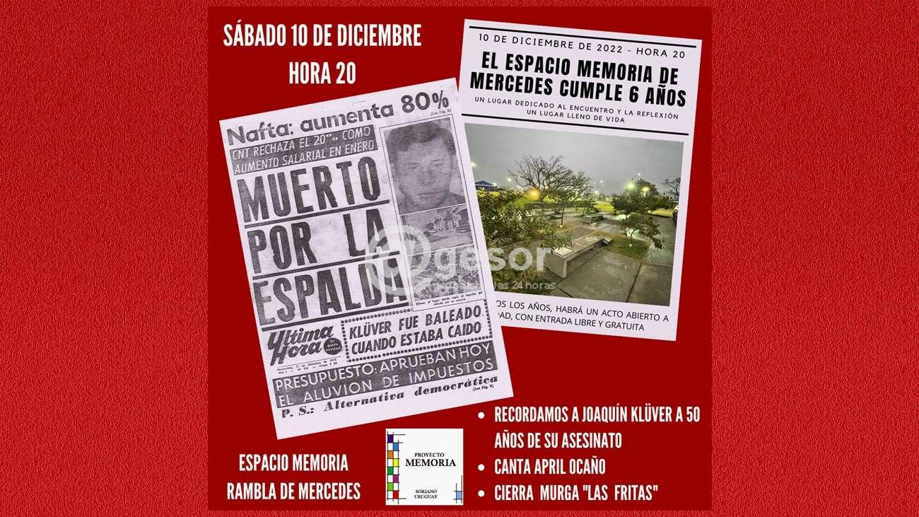 La Comisión Memoria, Justicia, y contra la Impunidad de Soriano organiza para el sábado 10 de diciembre un acto a 50 años del asesinato de Joaquín Klüver. Además será la oportunidad para celebrar el sexto año del Espacio Memoria, que recuerda a los detenidos desa...