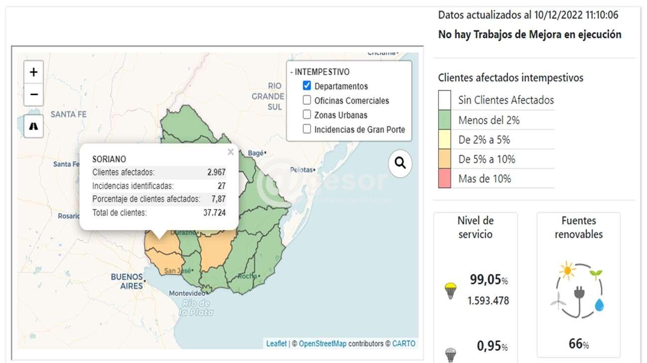 A esta hora son 2.967 clientes de UTE afectados por corte de energía eléctrica, producto de la situación climática producida en las últimas horas. En base a información proporcinada por el organismo a esta hora se están atendiendo 27 incidencias identificadas, s...