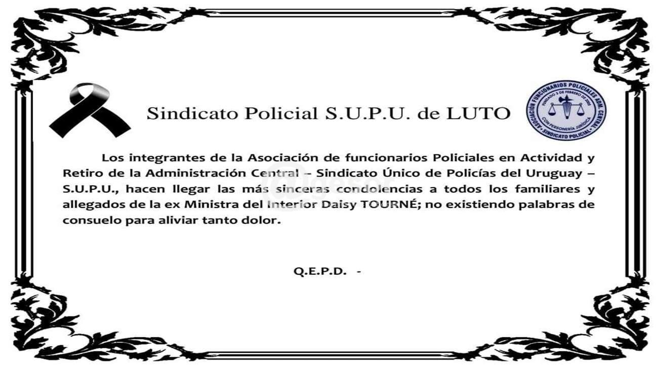 Los integrantes de la Asociación de funcionarios Policiales en Actividad y Retiro de la Administración Central -Sindicato Único de Policías del Uruguay- SUPU, hacen llegar las más sinceras condolencias a todos los familiares y allegados de la ex Ministra del Interior Daisy TOURNÉ;...