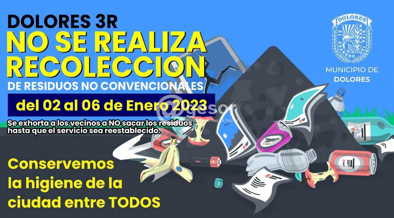 Desde el Municipio de Dolores se hace saber a la población que del 2 al 6 de enero 2023 no se realiza recolección de residuos no convencionales del programa Dolores 3R.