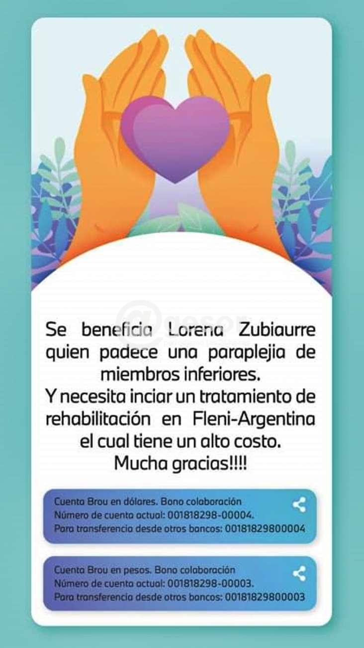 Se requiere la colaboración para apoyar a Lorena Zubiaurre que padece una paraplejia de miembros inferiores y necesita iniciar un tratamiento de rehabilitación en la clínica Fleni de Argentina, el cual tiene un alto costo. Muchas gracias!!! a todas aquellas personas que puedan apoyar.