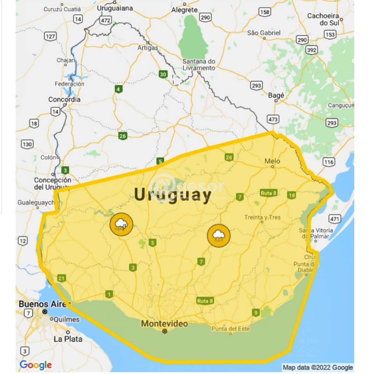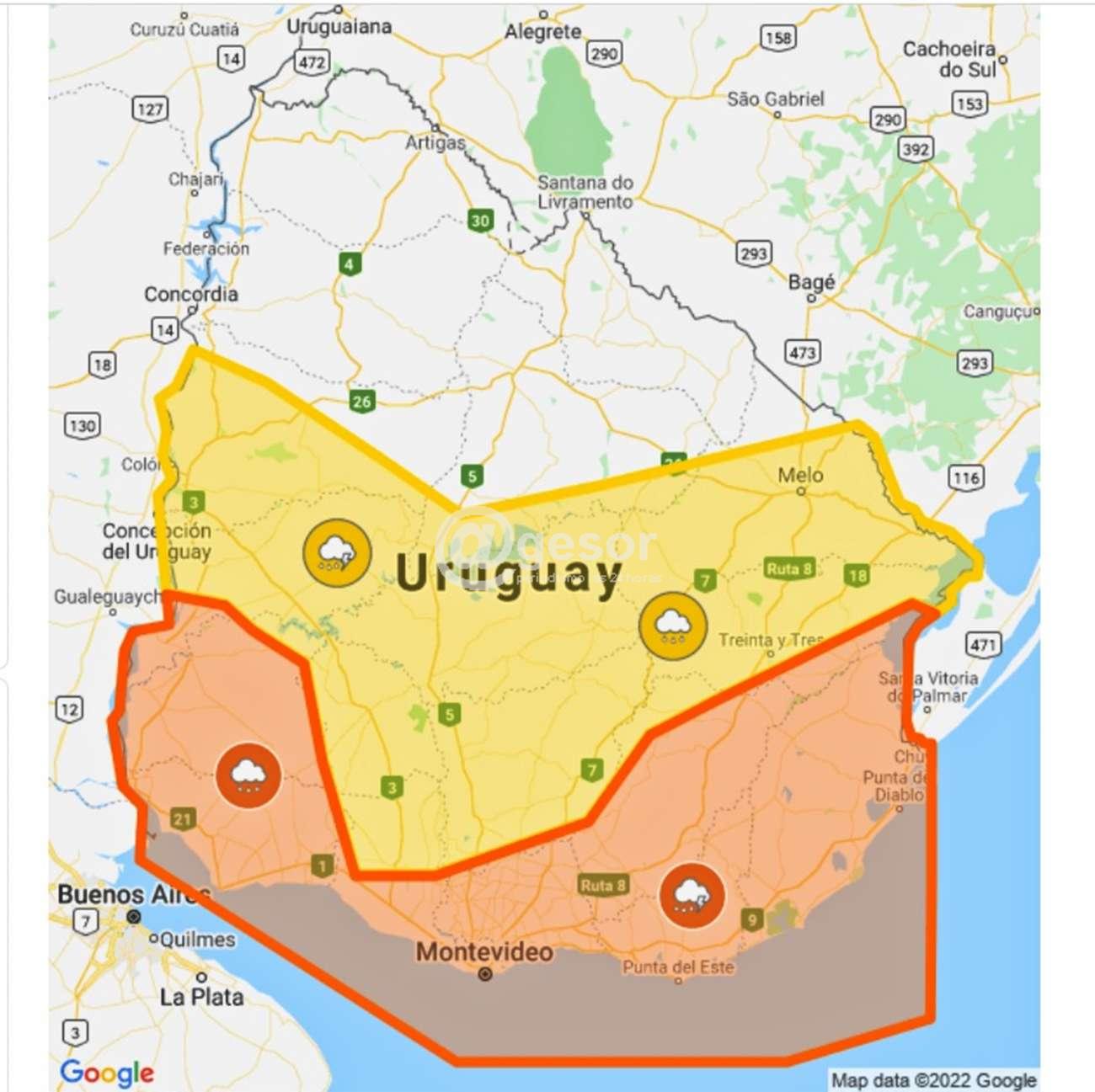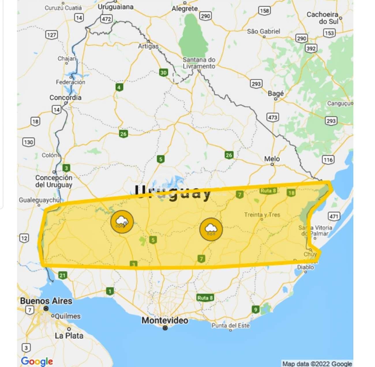 INUMET emitió alerta meteorológica de INUMET con parte del territorio en naranja y otro en amarillo que se extiende hasta las 18.30 horas cuando se actualizará. La probabilidad de ocurrencia es menor a 75% por tormentas fuertes y lluvias intensas.