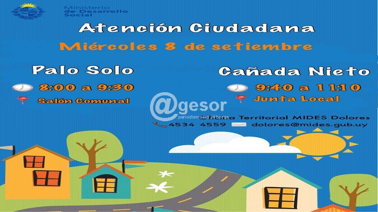 El Ministerio de Desarrollo Social continúa con la atención ciudadana en las localidades pequeñas del departamento. Este miércoles 8 de setiembre le toca el turno a Palo Solo y Cañada Nieto.