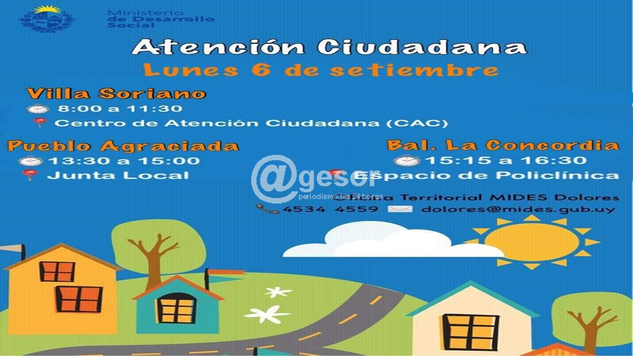 El Ministerio de Desarrollo Social continuará este lunes 6 de setiembre realizando su trabajo de Atención ciudadana. Esta vez el turno le toca a los vecinos de tres localidades: Villa Soriano, Agraciada y Balneario La Concordia.