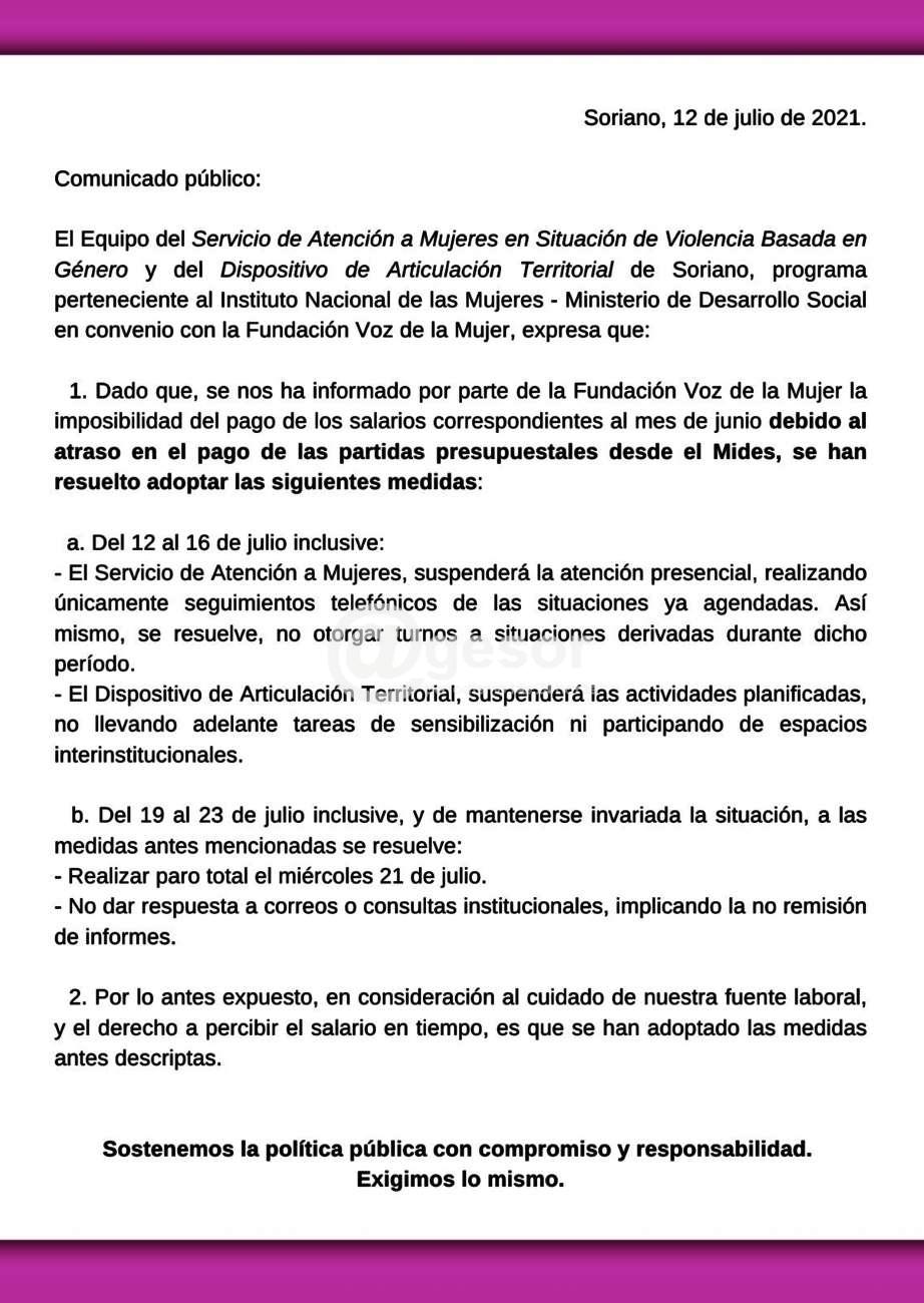 Desde este martes 13 hasta el viernes 16 el Equipo del Servicio de Atención a Mujeres en Situación de Violencia Basada en Género y del Dispositivo de Articulación Territorial de Soriano, programa perteneciente al Instituto Nacional de las Mujeres que funciona en la órbita del Ministerio de Desarrollo Social, en...