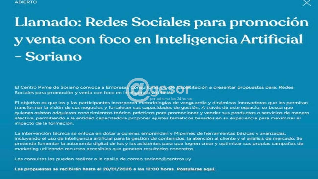 Se realiza un llamado a consultores/as formados y con experiencia en redes sociales, marketing digital e inteligencia artificial, interesados en presentar propuestas para el desarrollo de esta actividad en el departamento de Soriano. Las personas interesadas deberán completar la información solicitada y postularse a en la web de AN...