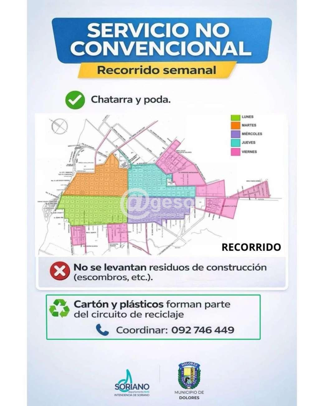 Se informa el recorrido semanal del servicio no convencional, destinado al retiro de chatarra y poda, según las zonas establecidas en el plano correspondiente.