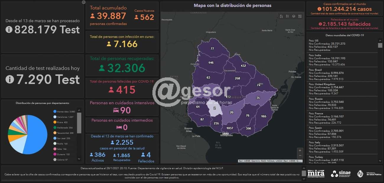 Con el análisis de 7.290 pruebas para la detección de COVID-19, este jueves 28 fueron identificados 562 casos nuevos, informó el Sistema Nacional de Emergencias (Sinae). Hasta el momento hay 7.166 casos activos, de los cuales 90 pacientes están en cuidados intensivos. En la jornada se confirmó el fallecimiento ...