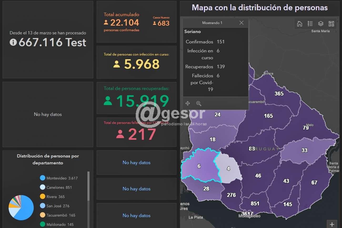 De acuerdo a la información proporcionada por el Ministerio de Salud Pública (MSP), hoy se llevaron a cabo 7.887 análisis y se detectaron 683 nuevos casos de Coronavirus COVID-19. De los 683 casos nuevos, 419 son de Montevideo, 86 de Canelones, 66 de Rivera, 20 de San José, 18 de Salto, 15 de Tacuarembó, 15 de ...