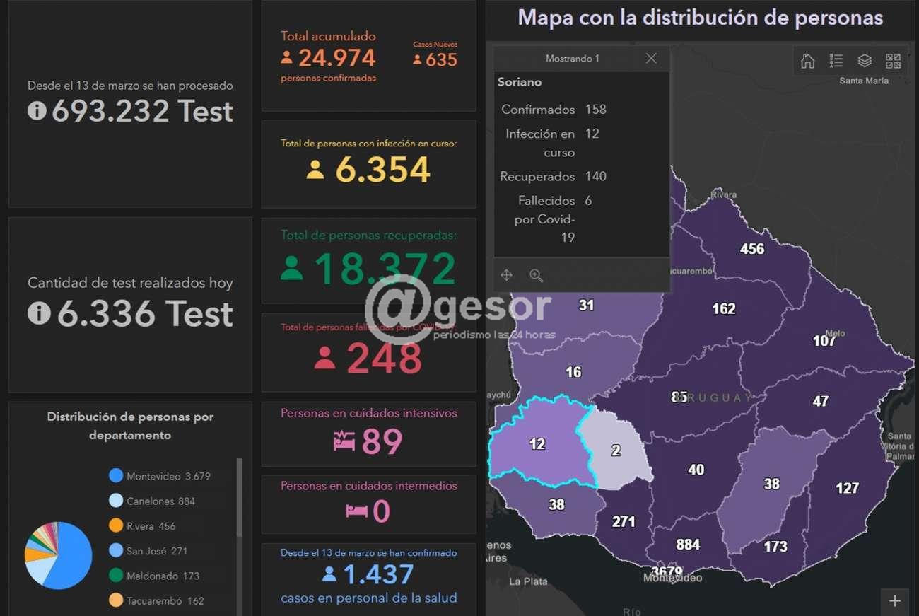 De acuerdo a la información proporcionada por el Ministerio de Salud Pública (MSP), este sábado se llevaron a cabo 6.336 análisis y se detectaron 635 nuevos casos de Coronavirus COVID-19. De los 635 casos nuevos, 374 son de Montevideo, 66 de Rivera, 50 de Canelones, 27 de Rocha, 38 de Maldonado, 14 de Cerro Largo, 12 ...