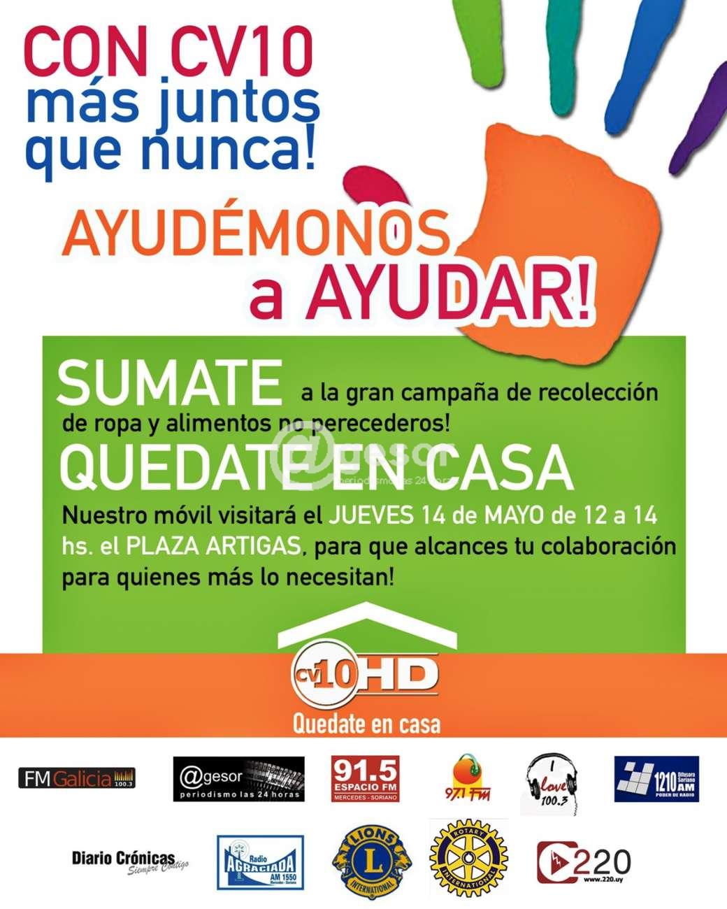 Este jueves 14 de mayo el móvil de CV10 estará en plaza Artigas de 12.00 a 14.00 horas con el apoyo de @gesor y otros medios de comunicación, con el apoyo de clubes Rotarios y de Leones, para que alcances tu colaboración para quienes más lo necesitan en una campaña solidaria de recolección de ropa...