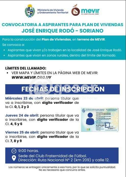 El Ministerio de Vivienda y Ordenamiento Territorial junto a MEVIR están realizando convocatoria a aspirantes para plan de viviendas en José Enrique Rodó (Soriano) para la construcción del plan de viviendas, en terreno de MEVIR.