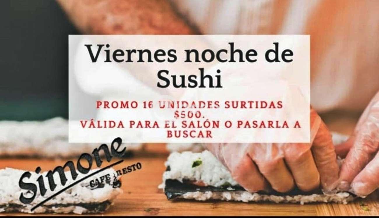 Este viernes, promo de Sushi en SIMONE Café & Resto en el local de avda. Lavalleja y Sánchez, 16 unidades surtidas: salmón, camarón, vegetariano, $ 500, además de toda nuestra carta. Podés reservar tu lugar a través de nuestras redes sociales Facebook o Instagram como también por el cel...