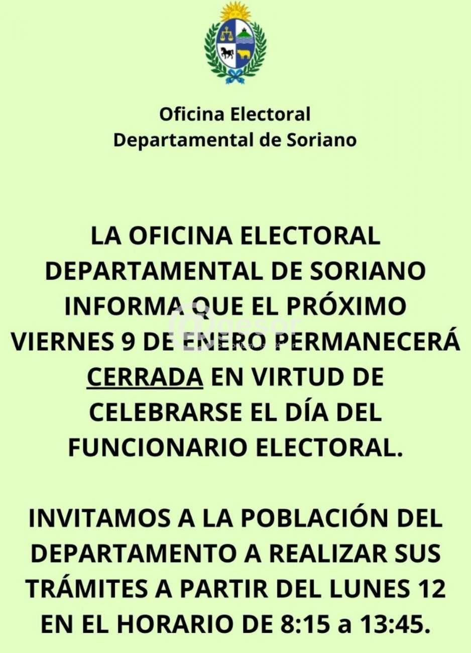 La Oficina Electoral Departamental de Soriano informa que este viernes 9 de enero permanecerá cerrada en virtud de celebrarse el Día del Funcionario Electoral.