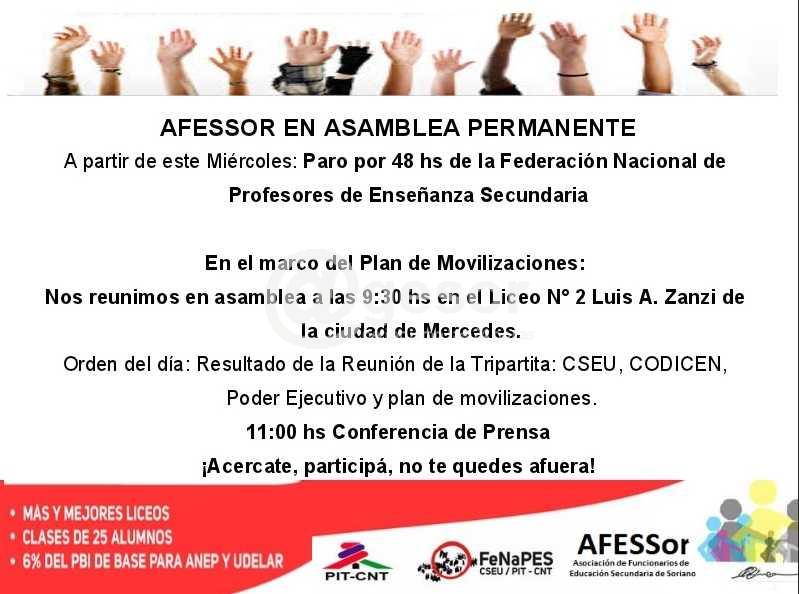 En sede del Plenario Intersindical de Soriano se reunió en asamblea la Asociación de Funcionarios de Enseñanza Secundaria de Soriano (AFESSOR) donde los docentes recibieron la información de lo considerado por la Asamblea de Delegados de la FENAPES que se reunió este sábado y decidió efectuar paro...