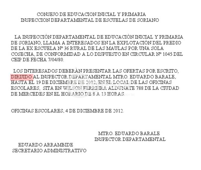 La Inspección Departamental de Escuelas de Soriano emitió un comunicado llamando a interesados en arrendar el predio de la Ex Escuela N° 36 de Las M...